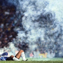 电视摄像机对准了倒在禁区里的门将罗哈斯,他身边有东西在燃烧和冒烟。